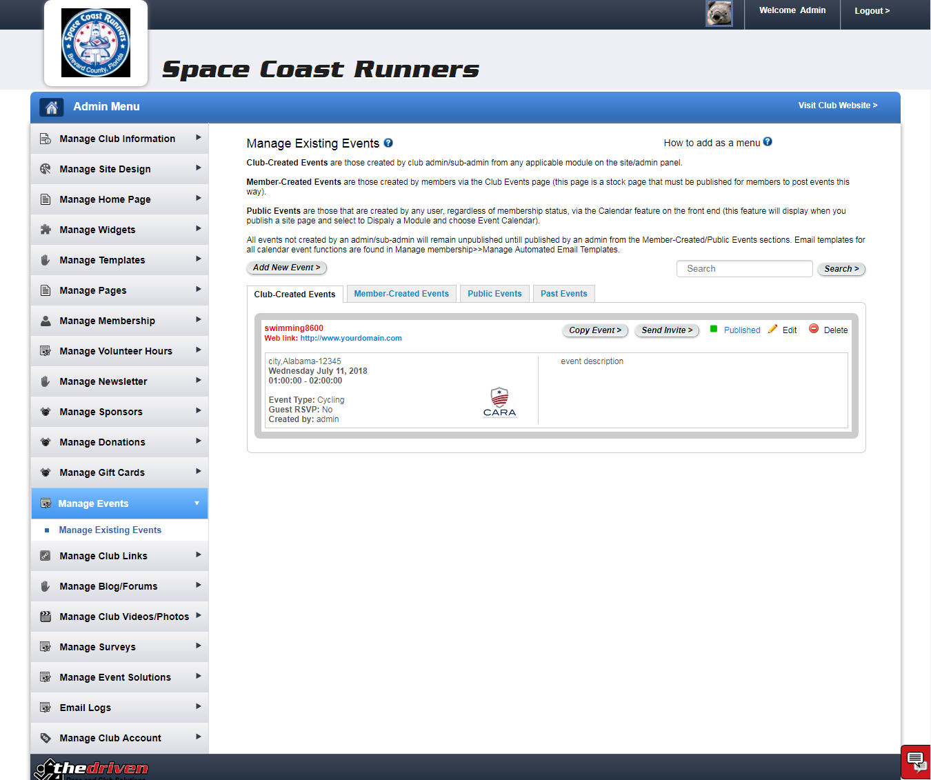 Create and manage events for your club members. With this feature, you can send an invitation to all or select club members and even include a countdown timer. Events will appear on the club site's home page.