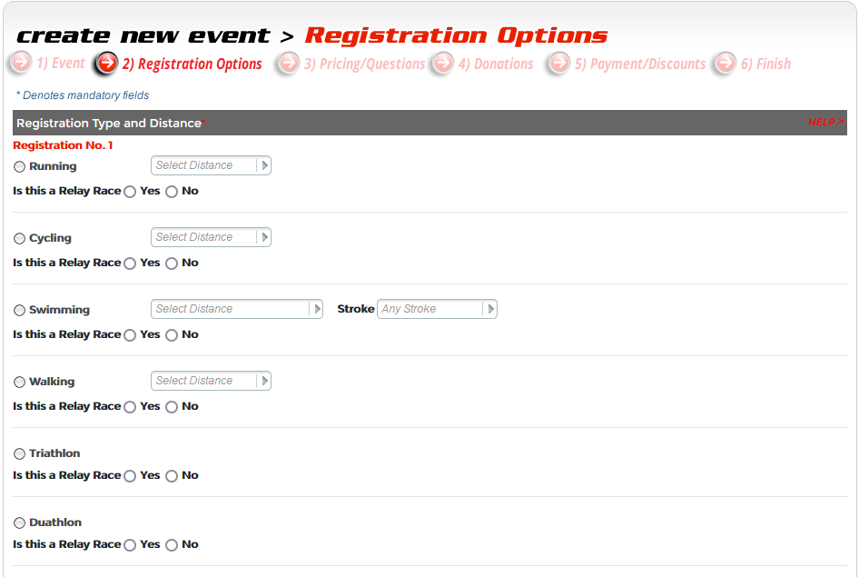 Step 2 - Login to your event director account and click on create new event, proceed to the first step of the event creation process if the page does not automatically load.