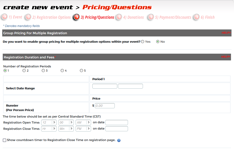 Step 4 - Pricing and Questions. Here you will setup the registration calendar to turn on and turn off registration, assign entry fees to your Registration option(s), and price increases. This step also allows you to create unique questions for your event that you want an attendee to answer when they are signing up.