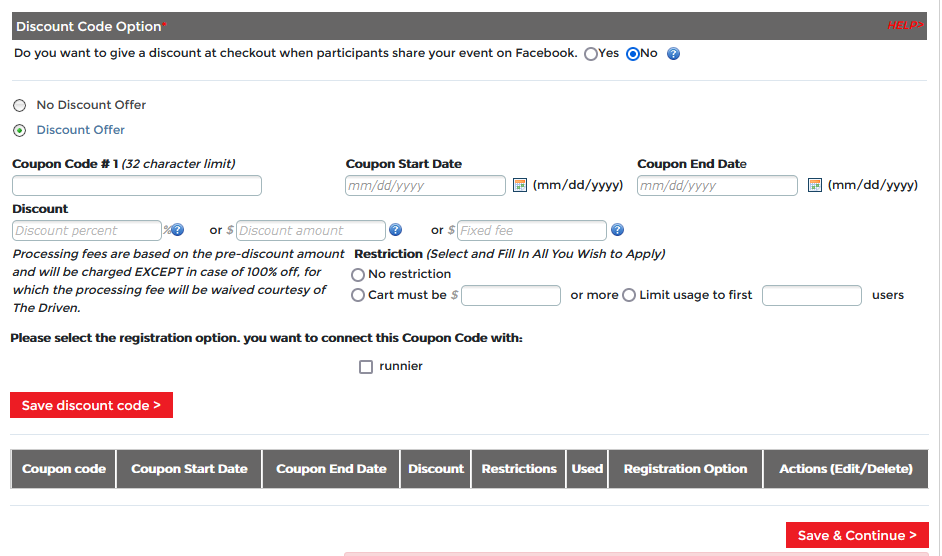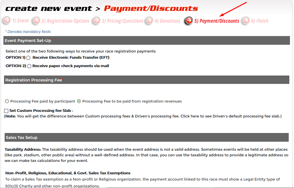 Step 6 - Payments and Discounts. This step is where you setup how you want to receive your event funds - either by Check or Direct Deposit. This step also allows you to create discount codes, set parameters to your discount codes like limited number of uses, discount by fixed amount or percentage, and date cutoff.