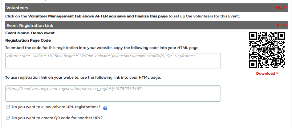 Here is where you will acquire the event registration link needed for anyone to signup for your event.