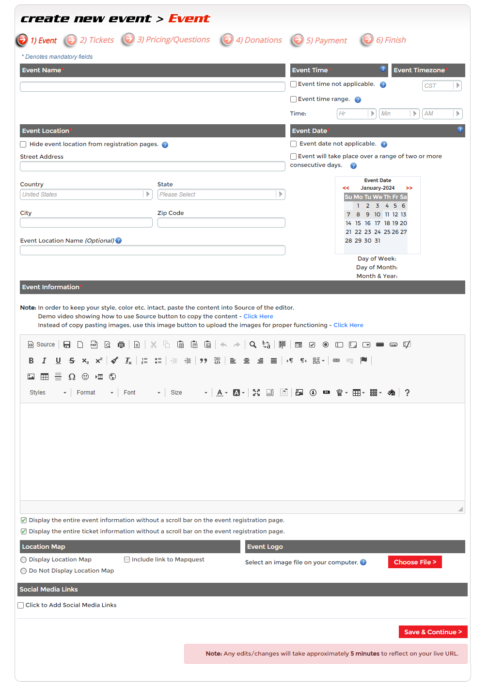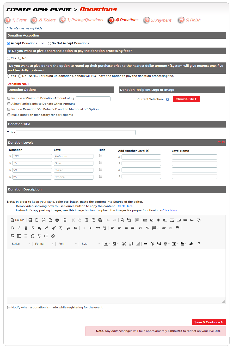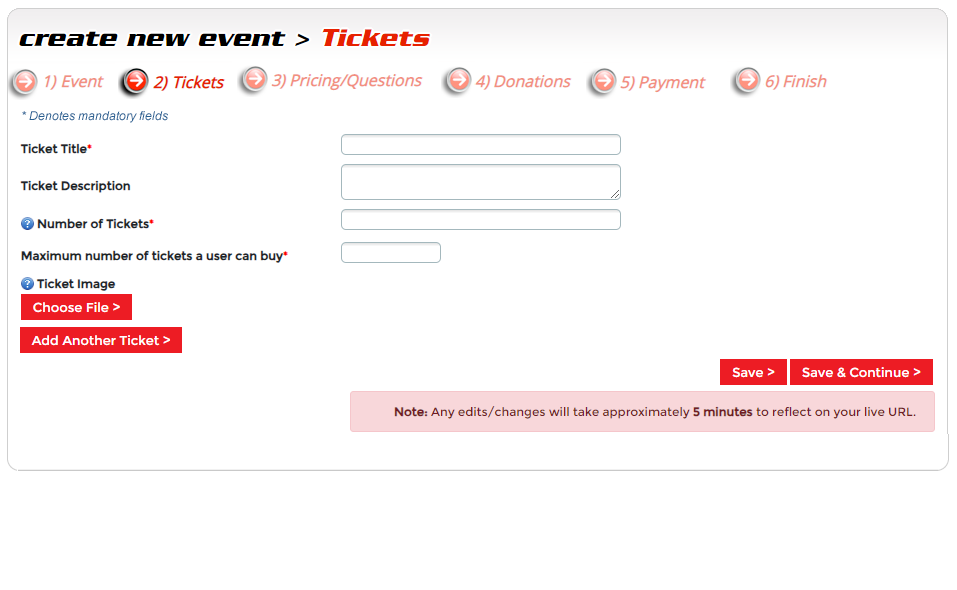 Step 3 - Tickets. Here you will create an event entry choice, and tickets you want to sell. A ticket will need to be created for each entry choice. For example, gala music, dinner, etc.