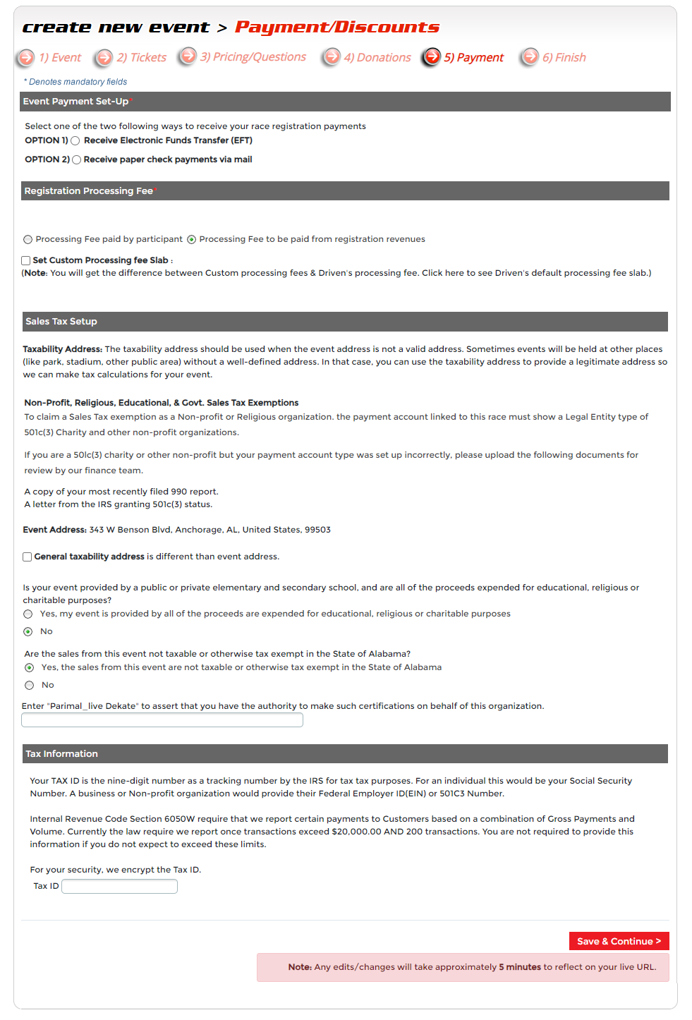 Step 5 - Payments and Discounts. This step is where you setup how you want to receive your event funds - either by Check or Direct Deposit. This step also allows you to create discount codes, set parameters to your discount codes like limited number of uses, discount by fixed amount or percentage, and date cutoff.