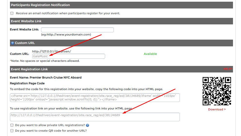 You can also create a custom registration link for your event if you don't want to display the standard registration link. Example of a custom registration link - "thedriven.net/GalaMusic".