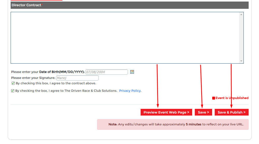 Step 6 - Finish. This is the last step to having your event ready to accept signups. This final step is where you can upload event waivers, contact information, access your unique registration Link (URL), and publish event to live.
